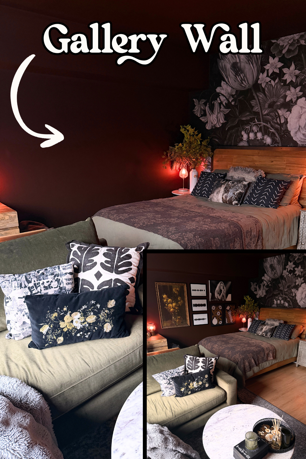 I created a gallery wall in my studio apartment, which is always a risky choice in a small space that already has dark painted walls and ceiling, floral peel and stick wallpaper, and an overall dark decor vibe. But once I hear that siren call of a decor idea, I must give into it.