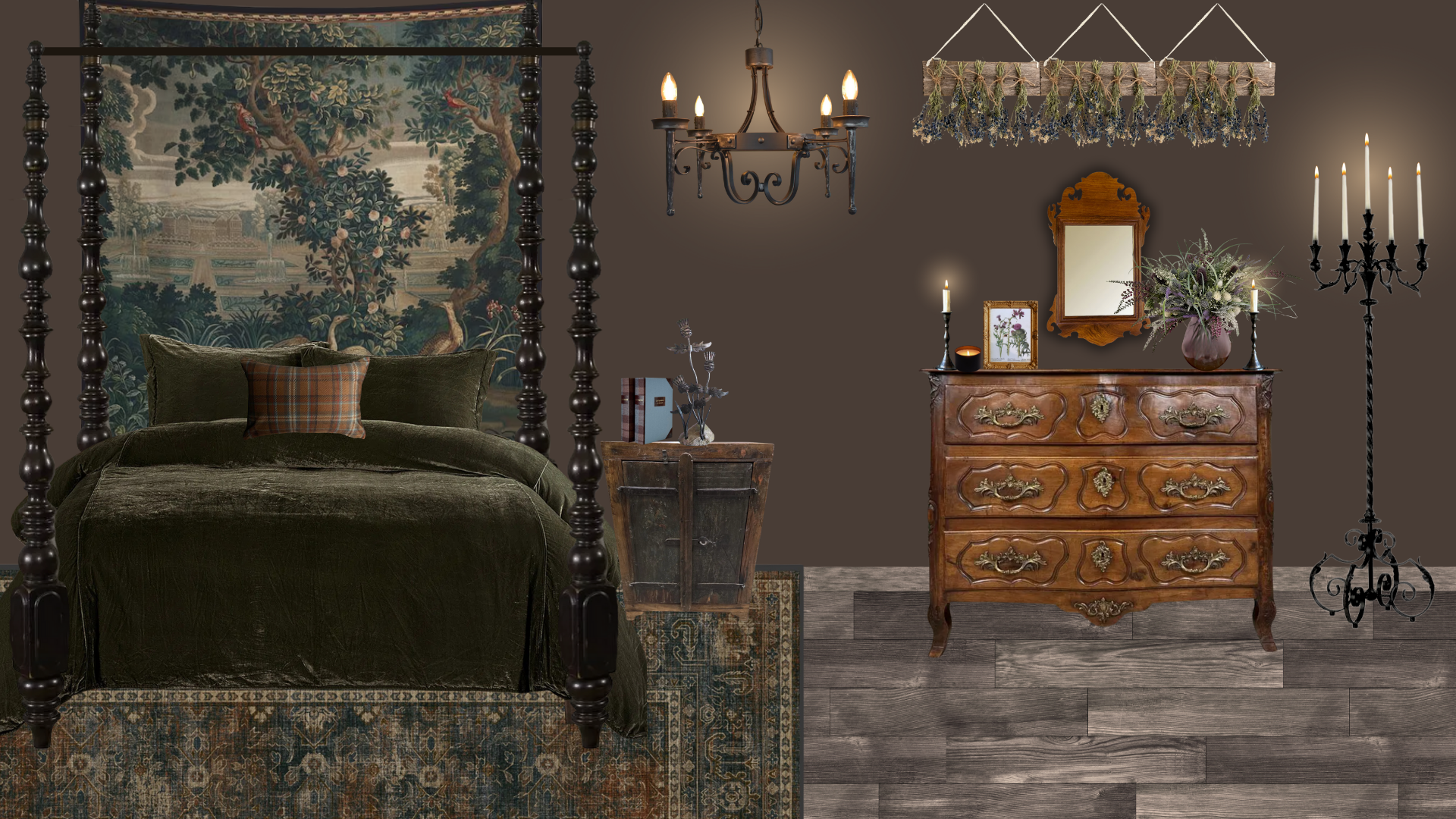 As you can see, it's all about the cozy warmth and dark, moody romance we see in the show. The four-post bed combined with the hanging tapestry kind of hints at the canopy bed look without fully having to commit to it, while also providing a focal point in place of a headboard.