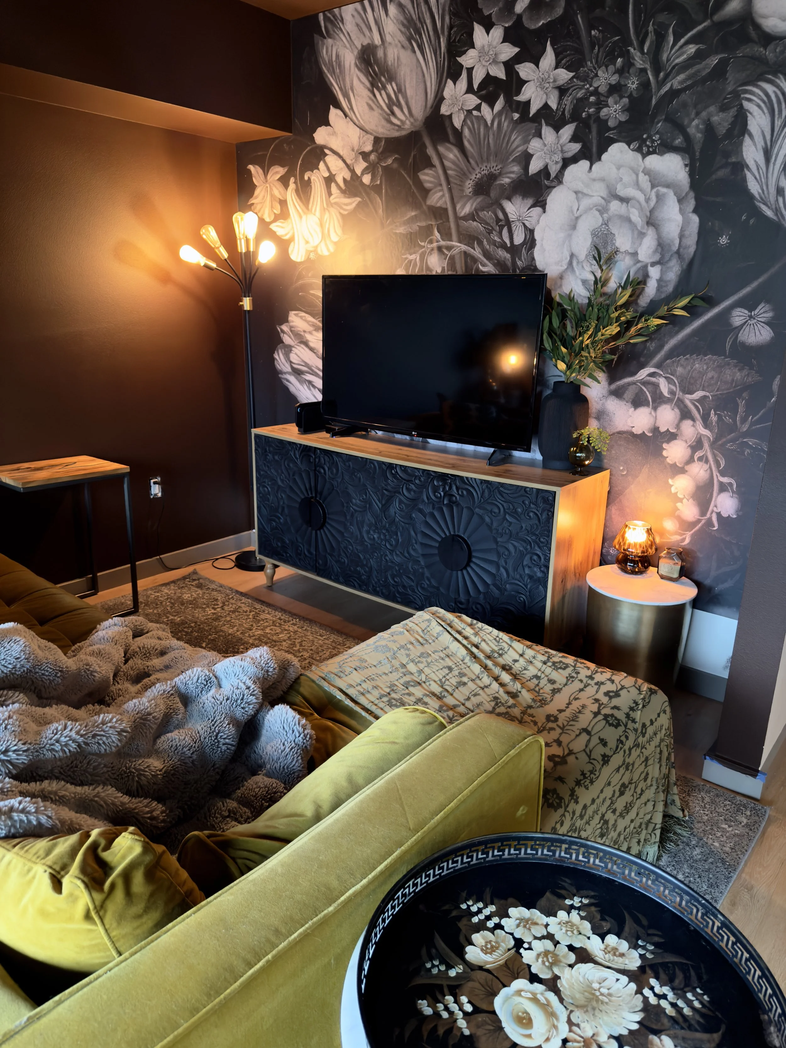 And already this tiny studio is utterly transformed through the power of dark paint, moody vibes, and a sheer stubborn force of will. A will that was not gonna let me dillydally on my decor dreams.